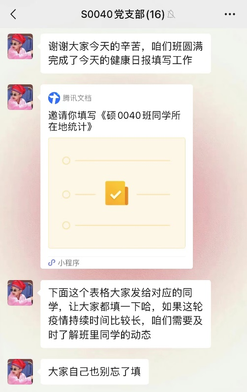 疫情发生以来,学院充分发挥党组织优势,让党旗在疫情防控一线高高飘扬,迅速形成指挥体系,组织学院各党支部搭建“党支书-党支委-党员-群众”四级责任体系,各级体系之间紧密对接,保障了重要通知的有效传递。设置“党支部抗疫责任人体系”,确保每位党员和群众都有对应抗疫责任人,号召党员充分发挥先锋模范作用,引导广大党员积极组织班级同学坚持每日健康打卡,高效完成全员核酸检测。